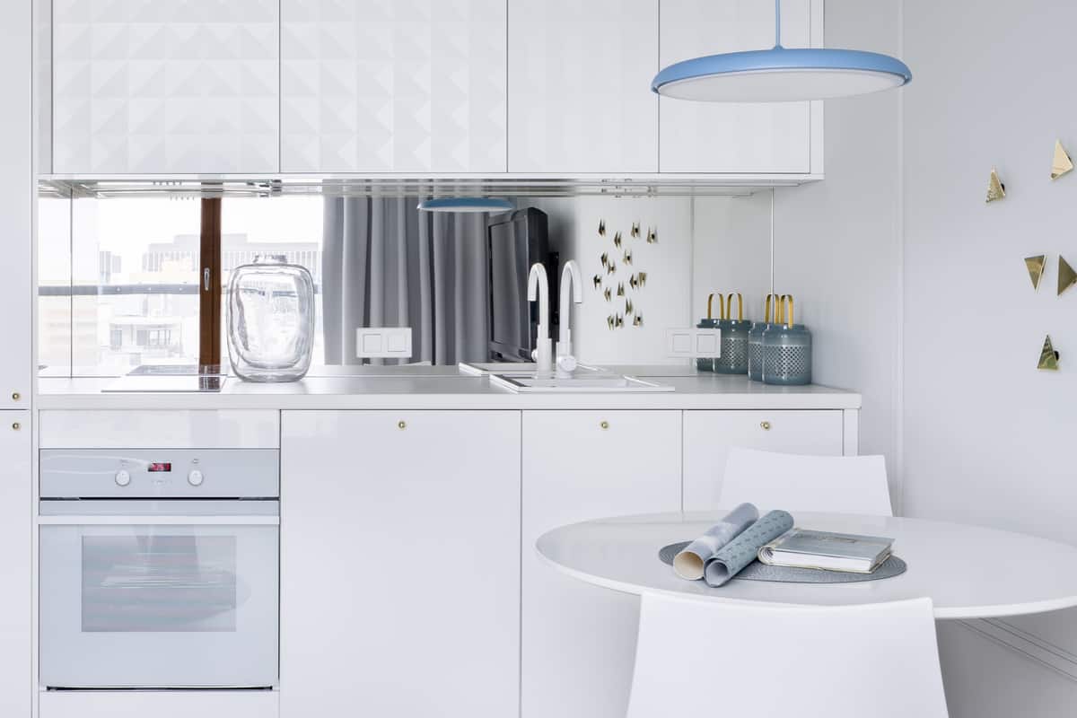 În ceea ce privește cromatica, cele mai recomandate sunt nuanțele deschise, naturale, care vor da senzația de mărire a spațiului. Alege tonuri de alb, crem sau maro deschis, inclusiv pentru blatul de bucătărie și draperii, pentru a obține o încăpere luminoasă și aerisită. De asemenea, mulți designeri de interior recomandă folosirea oglinzilor, care, datorită capacității de a reflecta lumina, vor largi optic spațiul. Un efect asemănător îl obții folosind uși de sticlă pentru dulapuri.